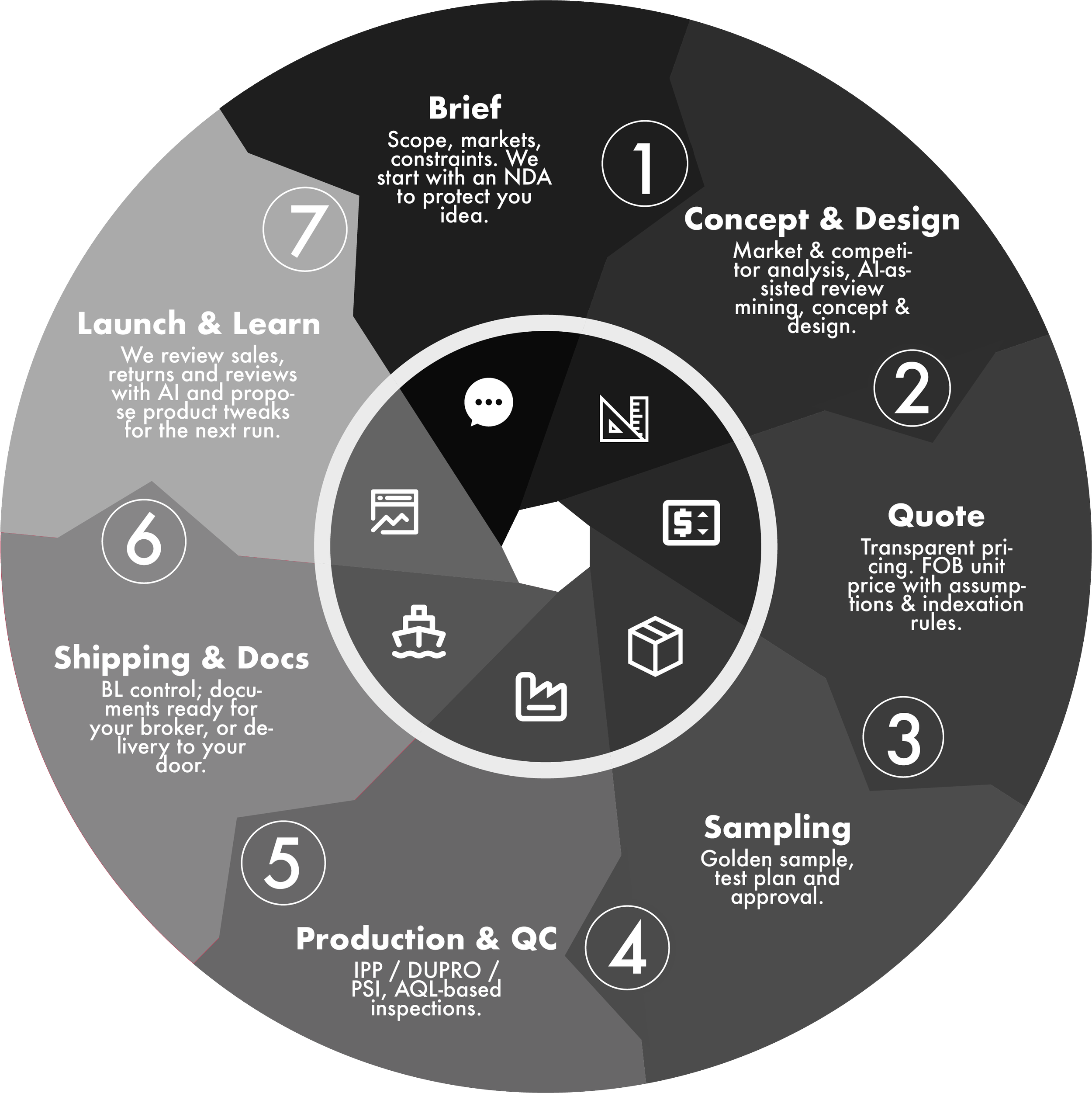 We keep the process tight and transparent so you always know where we are, what’s next and what we need from you. From first brief to repeat orders, it’s the same disciplined loop: